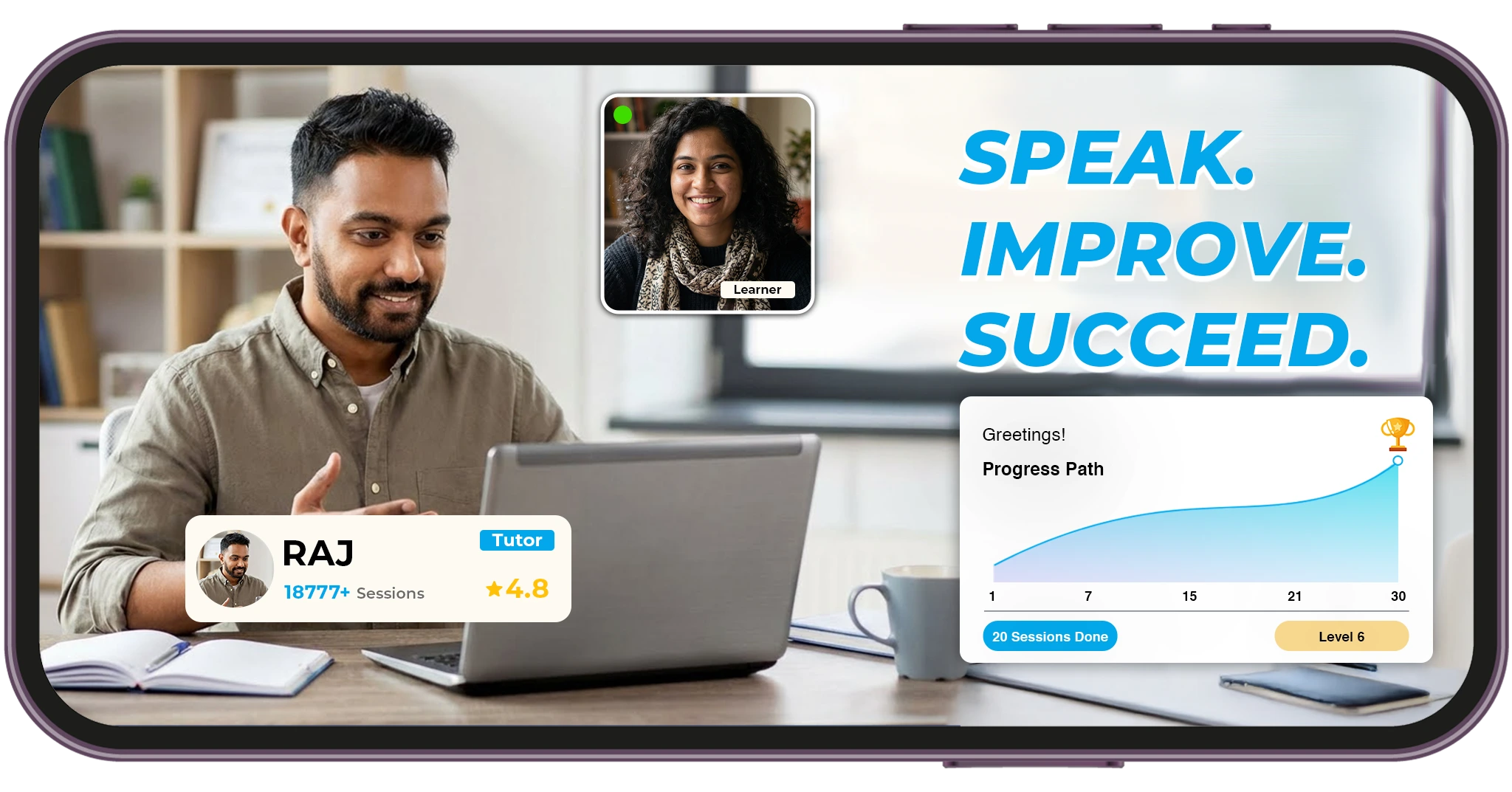 Connect with your tutor for an interactive 1-on-1 video call. Experience personalized learning in a comfortable environment.